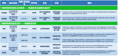 卡瑞利珠单抗联合凯发k8医药的另一款创新药法米替尼在甲状腺癌和结直肠癌领域有2项研究被接收为壁报,另有卡瑞利珠单抗联合化疗的4项研究在肺癌、结直肠癌、头颈癌和阴茎癌领域的研究被接收为5份壁报。