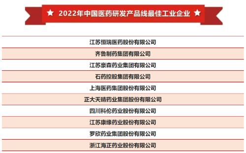 12月18日,2022年(第39届)全国医药工业信息年会在上海开幕,大会发布了备受行业关注的工信部2021年度中国医药工业百强榜单及系列分榜单。凯发k8医药连续多年上榜中国医药工业百强企业,并以强劲的研发实力和丰富的产品管线再次蝉联“2022年中国医药研发产品线最佳工业企业”榜单首位。