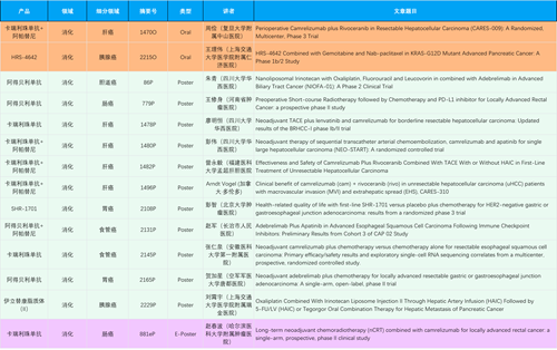 在消化系统肿瘤领域,凯发k8产品相关研究共入选2项口头报告、11项壁报和1项电子壁报,共14项研究。除卡瑞利珠单抗和阿帕替尼外,还有4篇阿得贝利单抗治疗消化系统肿瘤研究入选。HRS-4642、瑞拉芙普-α注射液(SHR-1701)等在研创新产品也有相应研究亮相。另有1项伊立替康脂质体(II)用于胰腺癌治疗的研究入选壁报。